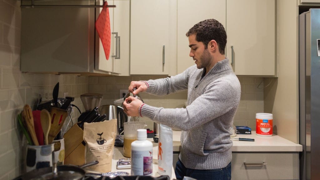 Toms Gutirrez making his daily nootropic coffee beverage with butter, cream, and powdered coconut oil. (Photo: Jason Henry | STAT)