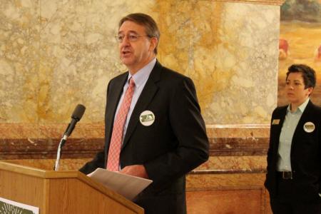 Duane Goossen of the Kansas Center for Economic Growth and Annie McKay of Kansas Action for Children on Wednesday announced a tax overhaul proposal. The plan would undo some tax cuts made in recent years by raising the top income tax rate and reinstate income taxes on hundreds of thousands of businesses. (Photo: Stephen Koranda | Kansas Public Radio)