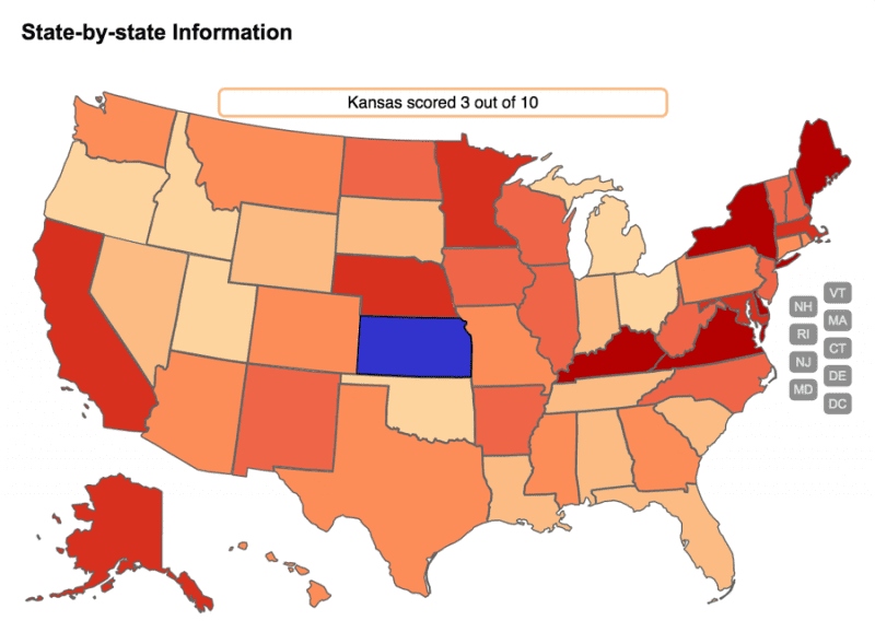 Kansas – along with Idaho, Michigan, Ohio, Oklahoma, Oregon and Utah – scored on only three of 10 key indicators measuring states’ efforts at outbreak prevention, detection, diagnosis and response. The indicators collectively offer a snapshot of state health systems’ strengths and weaknesses. Kansas had the same score last year.