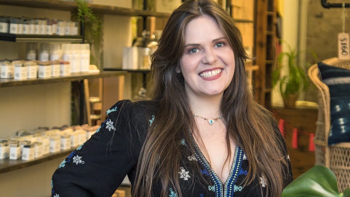 Savannah Northcraft pauses briefly for a photo while arranging her shop, Urban Provisions, in the East Bottoms for the holiday season. (Brad Austin | Flatland)