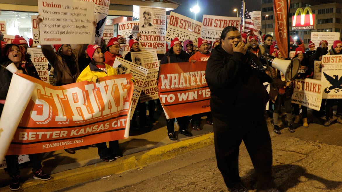 Between 81st and 85th Streets on Wornall Road in Kansas City, Missouri, there are half a dozen fast food restaurants: Taco Bell, Jimmy John’s, McDonald’s, Sonic. This afternoon, employees from these restaurants and others around the metro took to the streets to strike for “15 and a union”: $15 minimum wage and the right to…