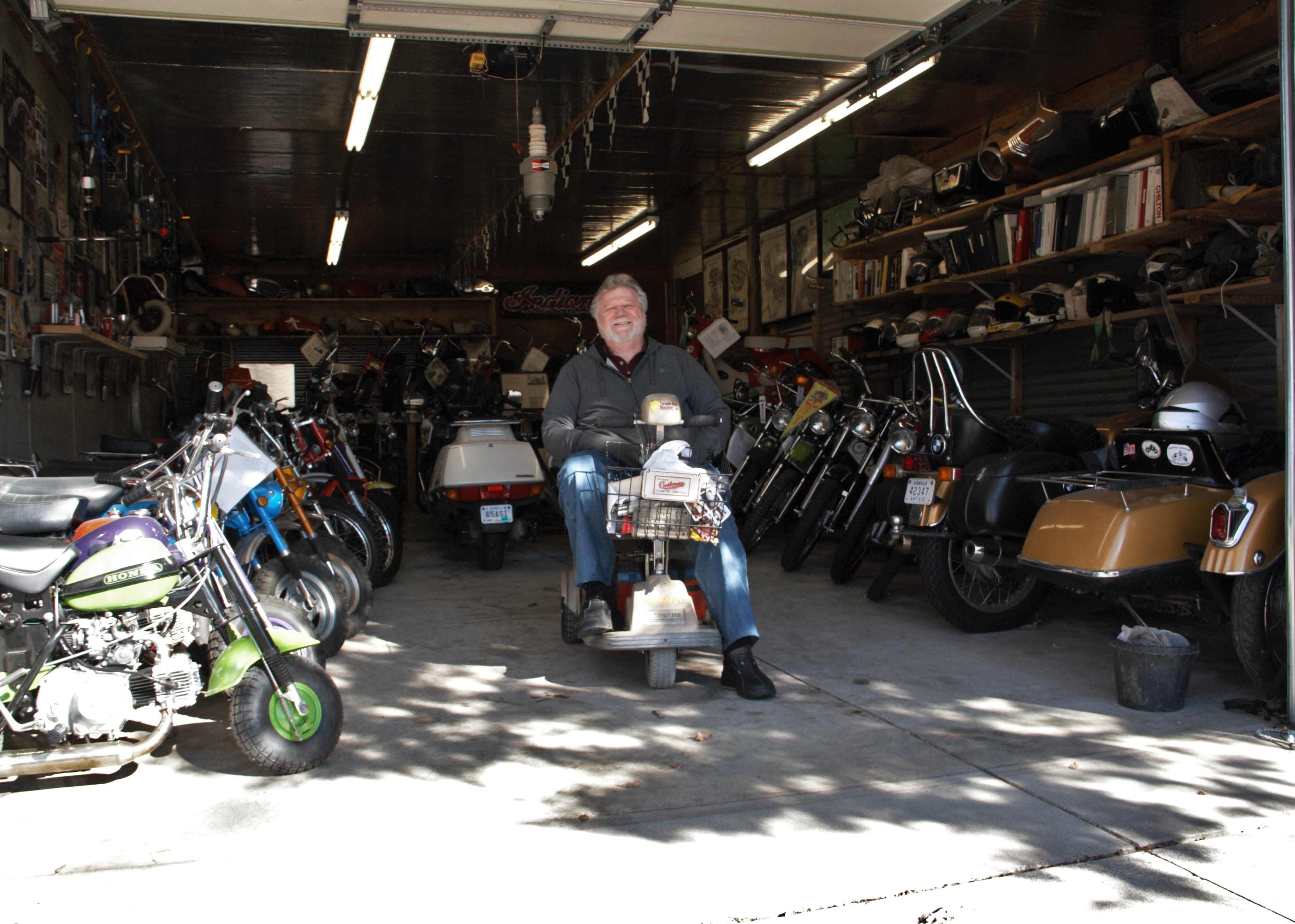 William “Bill” Brown emerges from the workshop at his home on his mobility scooter with a smile and a wave. Tom Petty and the Heartbreakers’ “Mary Jane’s Last Dance” can be heard in the background. Lines of motorcycles can be seen in the workshop behind Brown as he launches into a story about how he started riding motorcycles at a young age.