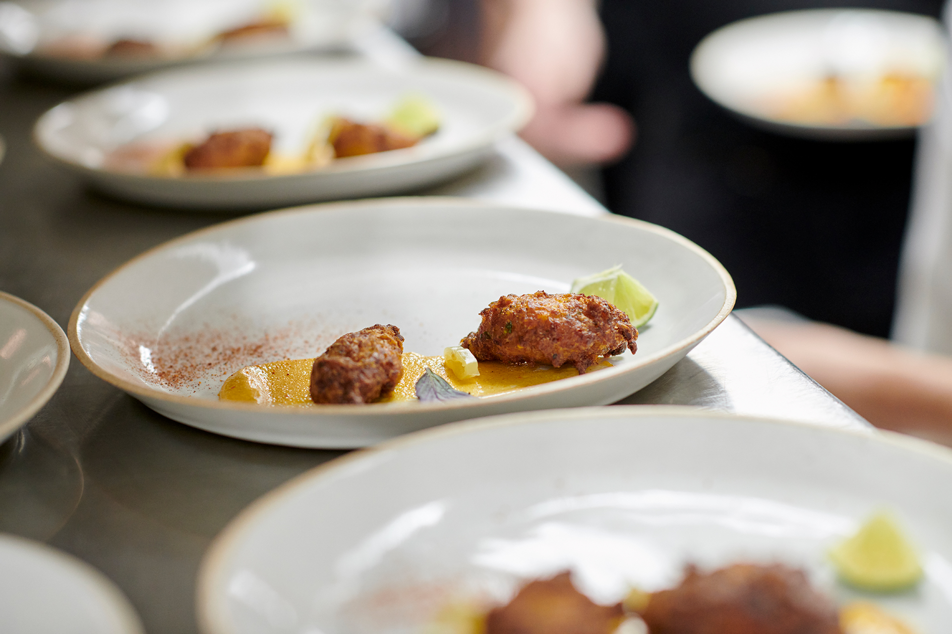 Course two: A take on bacalaitos – typically salt cod fritters – except with salted hybrid bass with annatto aoili, plantains and peppers.