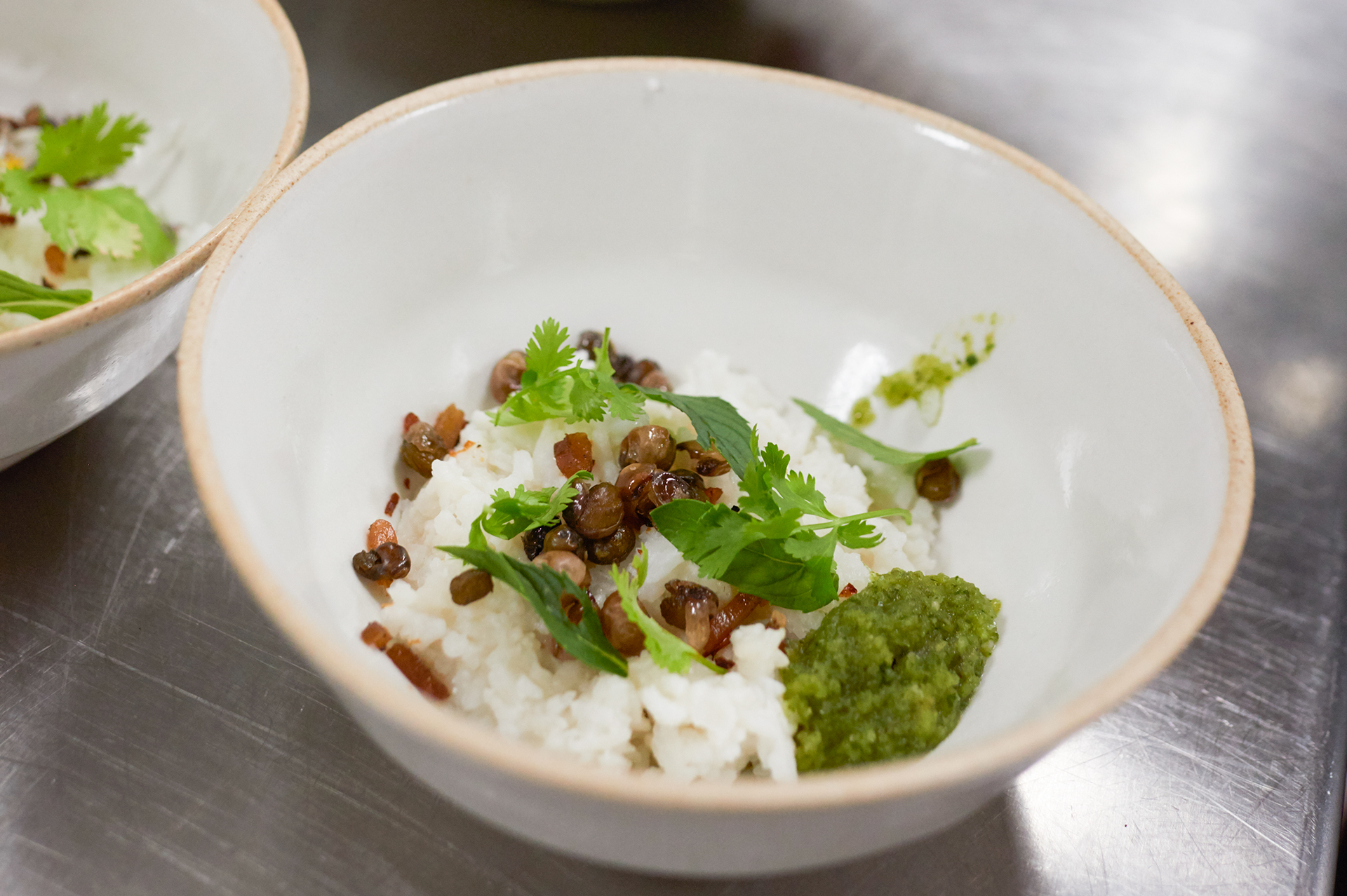 Course three: Arroz con gandules – rice with pigeon peas – except fried and topped with the artist’s mother’s sofrito, trout bacon, oregano and cilantro.