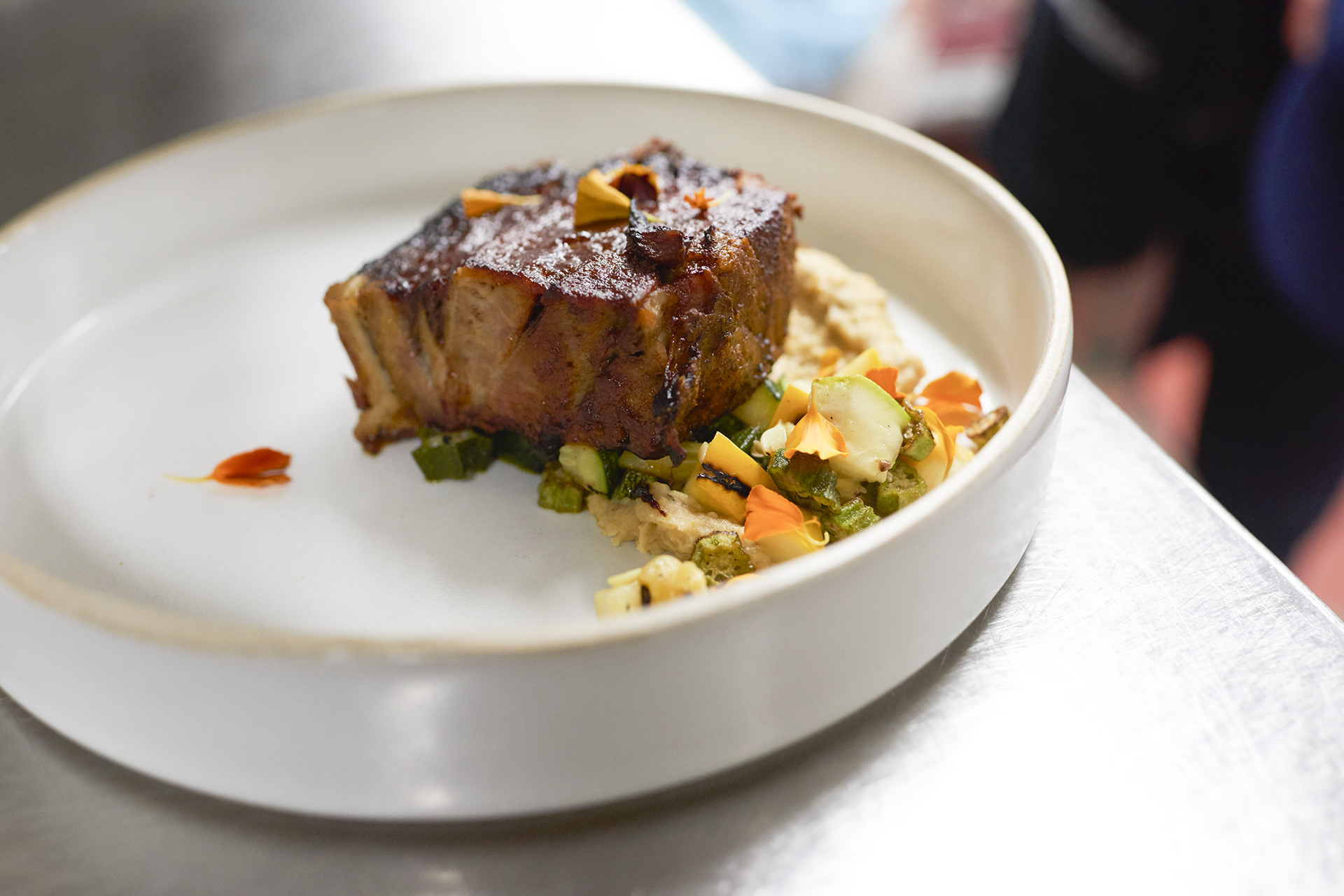 Course four: Pernil al horno – oven-roasted pork shoulder on a bed of arina de maiz, okra and summer squash.