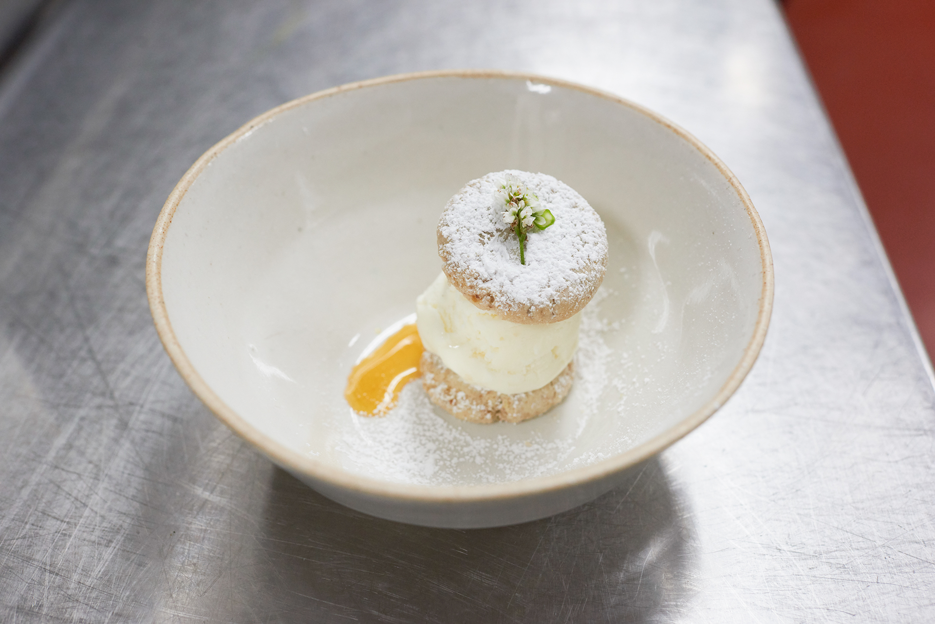 Course five: Ice cream sandwich made with polvorones, Puerto Rican shortbread cookies, and flan de queso ice cream.