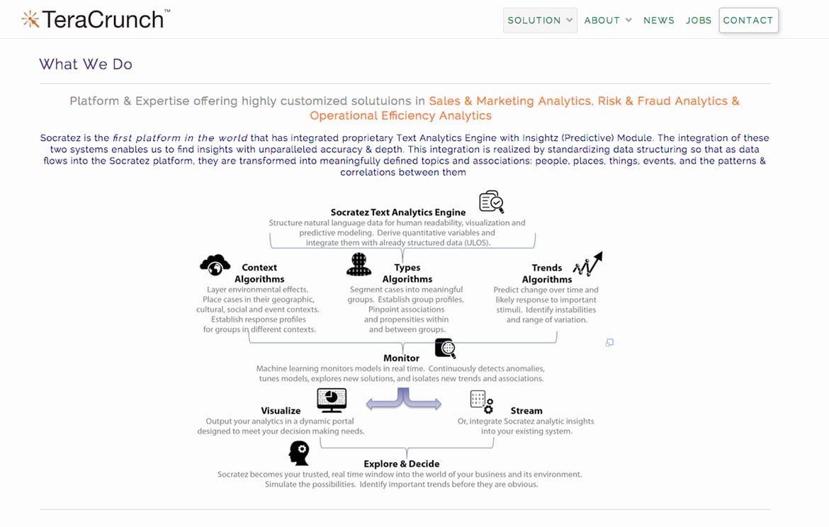 All of the data comes into our TeraCrunch engine. It could be feeds from the company; it could be feeds from social media, even emails. And then we use our predictive statistical models and algorithms. 20 percent of the process is tweaked to be specific, very specific to each company because every company is different. So, it’s not like a boxed product; it’s customized. If you just have a one-size-fits-all platform, which is what a lot of companies do, that won’t work for like, a sports team and for a hospital. They’re totally different entities with totally different problems and totally different language, so you’ve got to create the language first.
