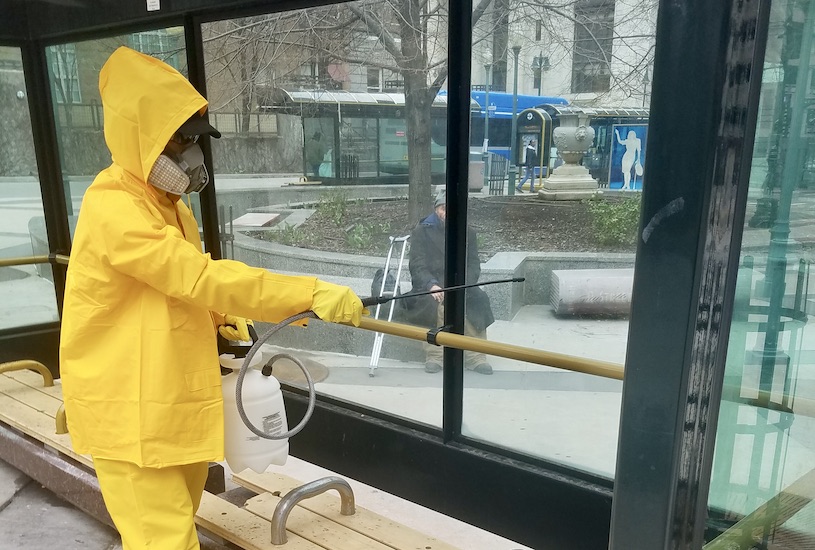By Kevin Collison The “bumble bees” who’ve come to symbolize the greater commitment to the safety and maintenance of downtown have taken on a new role–the frontline in sanitizing transit stations and other public spaces during the Covid-19 crisis. “We want our team to be part of the fight against the spread of the coronavirus…