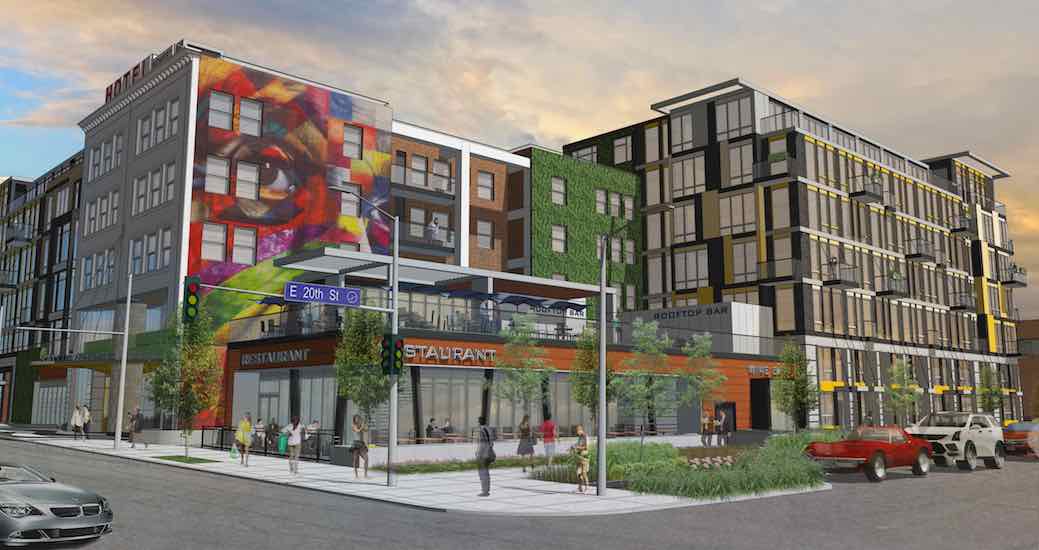 19th to 20th, Main to Walnut | 283 apartments; 11,000 square feet of retail | Cost: $76.8 million | Architect: BKV Group of Chicago | Construction began summer 2018