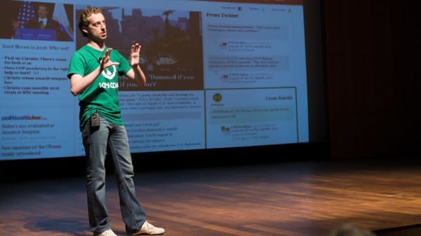 Entrepreneurs filled the auditorium inside the Kauffman Foundation for the anniversary edition of 1 Million Cups. This week featured one presenter with a mobile app development tool and another with a socially integrated search engine.