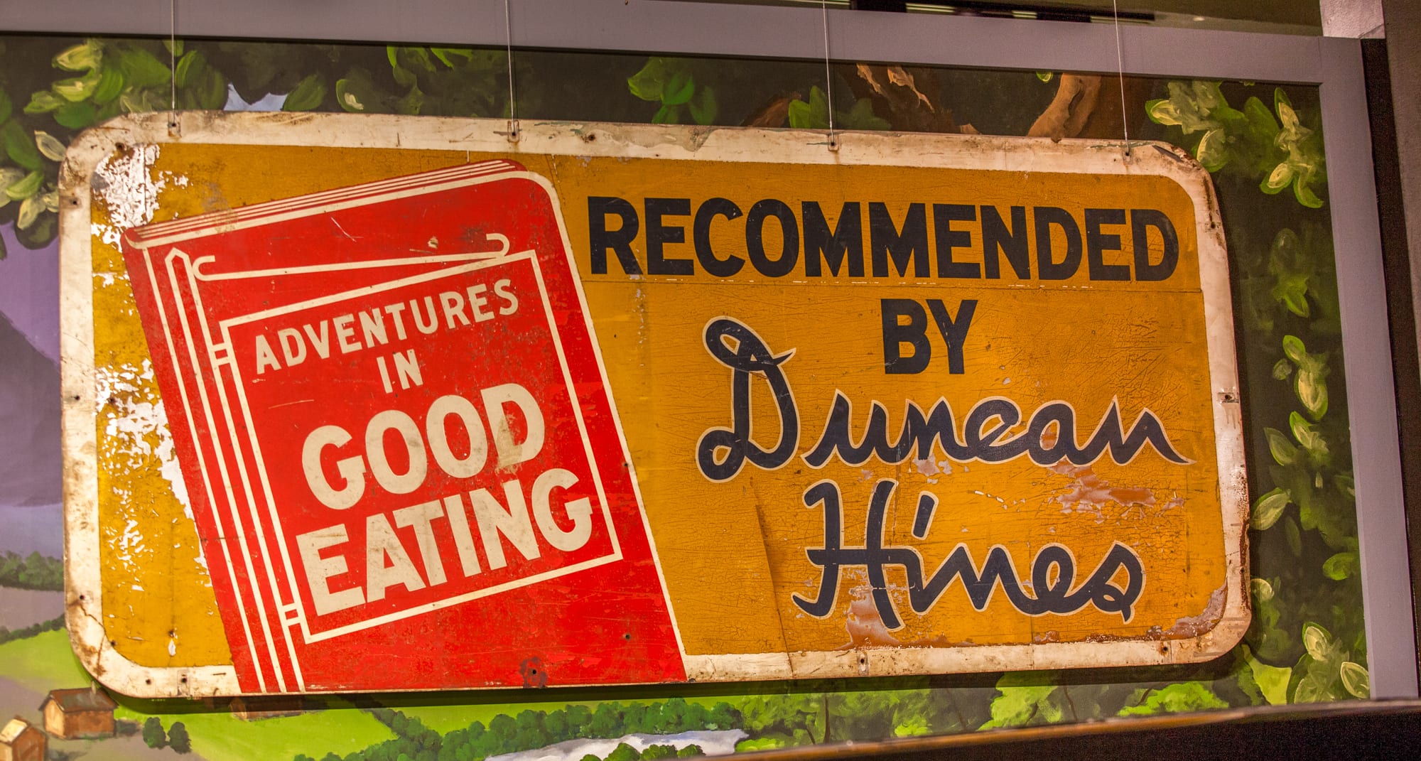 A roadside sign advertising Duncan Hines’ Adventures in Good Eating is on display at the Kentucky Museum at Western Kentucky University. (Courtesy of Clinton Lewis/Kentucky Museum/Western Kentucky University.)