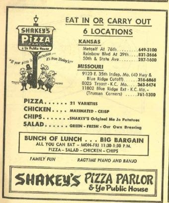 In Kansas City, we had a Shakey’s at 11802 Blue Ridge Boulevard and 8025 Troost Ave. in the 1970s. There were also spots at 9120 E 35th St. in Independence, Missouri, and Metcalf and 76th, Overland Park, Kansas, Rainbow Boulevard and 39th Street, and 50th and State Ave. in Kansas City, Kansas. Both Shakey’s in Kansas City were closed by 1981.