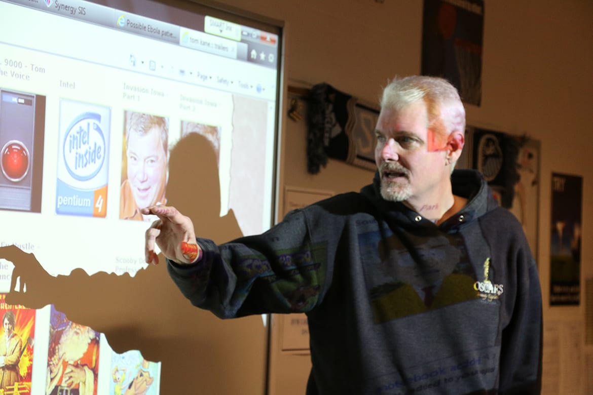 Voice-over actor Tom Kane shares clips of cartoons and video games featuring his work during career day at Blue Valley Middle School. (Photo by Lindsey Foat)