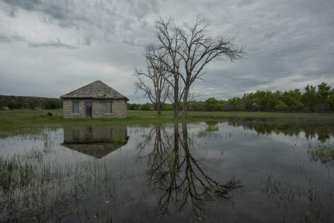 Water flooding from the North Platte River surrounds a shed near Lewellen, Neb. (Photo: Peter Stegen | Platte Basin Timelapse)