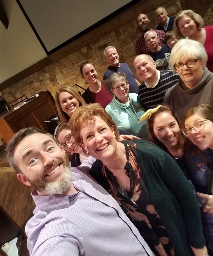 Jan Kraybill with Ryan Main, director of music, and the choir of Village Presbyterian Church on Antioch on the night of Kraybill’s Grammy nomination.