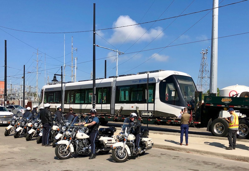 By Kevin Collison The Kansas City Streetcar Authority got a belated present for its third birthday Monday morning, a shiny new vehicle fresh from Spain to add to its existing fleet of four. The new streetcar, dubbed #805, arrived at Third and Grand by flatbed truck after leaving port near Houston Friday morning. It was…