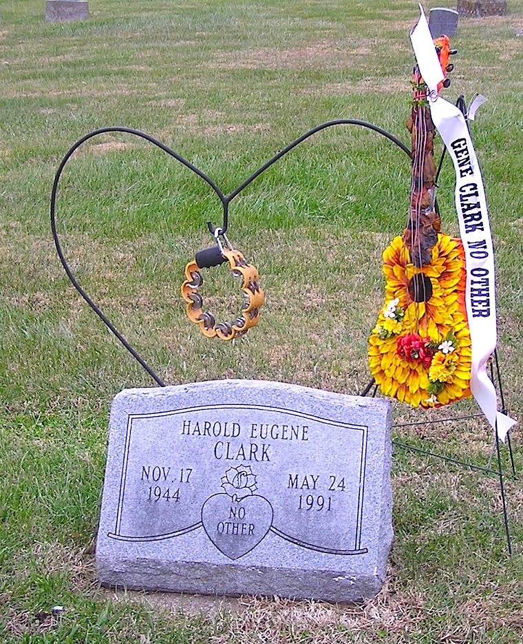 Upon Gene Clark’s death, his two sons, Kai and Kelly, alerted his parents and siblings that he had wanted his gravesite to be in Tipton. In recent years the singer’s grave marker has been made vivid by a tambourine suspended from a heart fashioned from a slender metal rod, placed there by a Clark cousin.