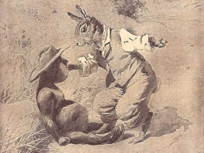 An archetypal trickster tale, the tar baby story describes how a fox entraps a rabbit by using a tar figure. The rabbit gets stuck to it in five places – front and hind feet and head – after mistaking it for a real person and pummeling it for not replying to his polite greetings. Trapped but tactical as always, the rabbit begs the fox to roast, hang, skin or drown him but please not to throw him into the briar patch. Of course, the fox does precisely that, hoping to inflict maximum pain on his enemy, without knowing that rabbits are born and bred in thickets. The rabbit skips out as “lively ez a cricket in de embers” to live another day.