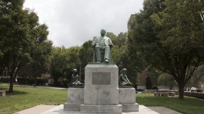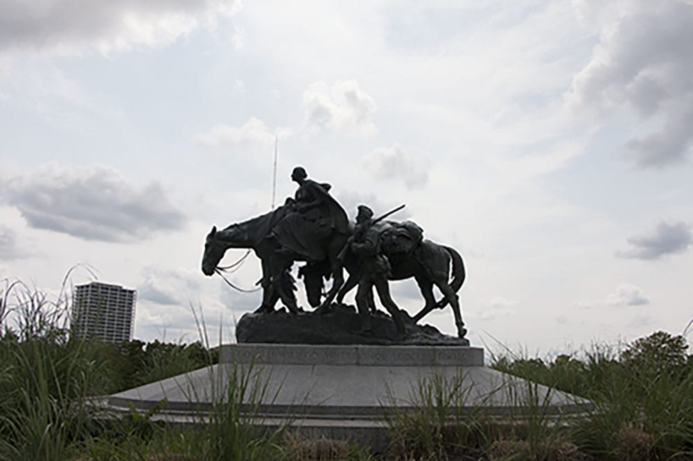 The rest, they say, is history. As we’ve been tracking down information about this monument — and other interesting ones around the Kansas City area — Confederate monuments across the U.S. have shot into the spotlight. Spurred by the white supremacist marches in Charlottesville, Virginia and exacerbated by President Trump’s divisive comments, the controversy came home to roost in KC over the weekend. The United Daughters of the Confederacy Monument, at this location since 1958, was vandalized overnight on Friday. By Sunday morning, KC’s Parks and Rec department had boarded up the monument and prepared it for removal.