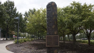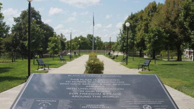This memorial commemorates black veterans throughout American history. The memorial includes a walkway connecting a polished granite monument with a flagpole. The sidewalk is lined with benches, lights and oak trees.
