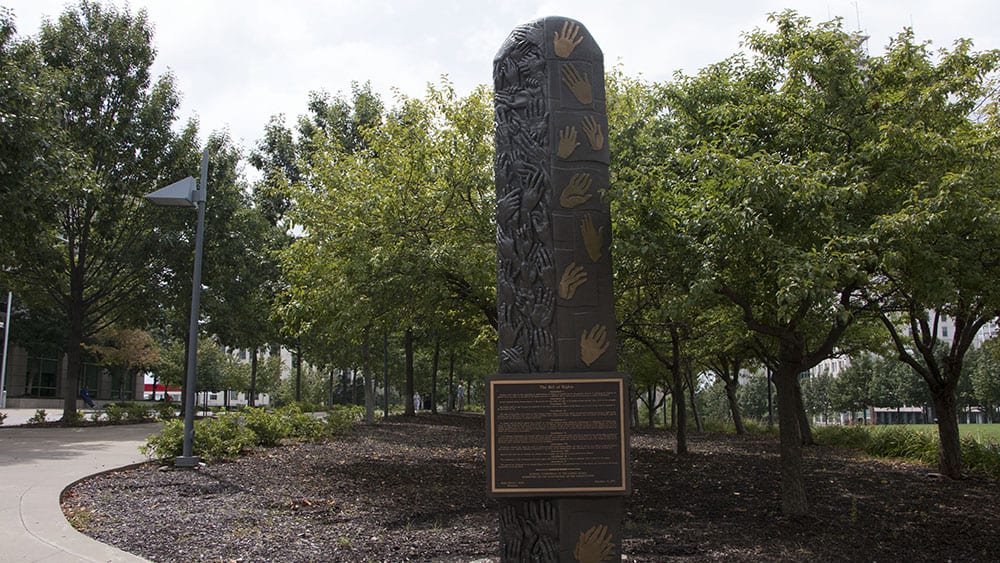 The U.S. District Court in Kansas City received a plaque commemorating the bicentennial of the U.S. Constitution. Shirley Wright, the wife of one of the judges, suggested that they choose her art teacher, Kwan Wu, to design a display for the plaque. Wu was a naturalized citizen and emigrant from China. Local lawyers, judges and businesses raised more than $600,000 to fund the sculpture. The hands on the statue are from people in each of the 50 states and represent all ages, races, religions and genders.