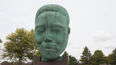 This memorial commemorates the life and career of Charlie Parker, the legendary jazz musician from Kansas City. The sculptor, Robert Graham, and his wife, actress and model Anjelica Huston, attended the dedication. The bright green sculpture is a large version of Parker’s face. The sculpture wasn’t cast whole but assembled piece by piece, which creates a grid pattern on Parker’s face.