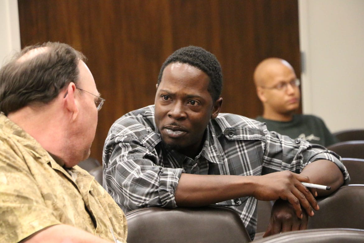 Kansas City, Kan., resident Fred White (right) talked to another city resident, Mike Kimball, during a break-out session during the Thursday evening town hall. (Photo by Mike Sherry/The Hale Center for Journalism)“There is no shortcut to trust,” he said.