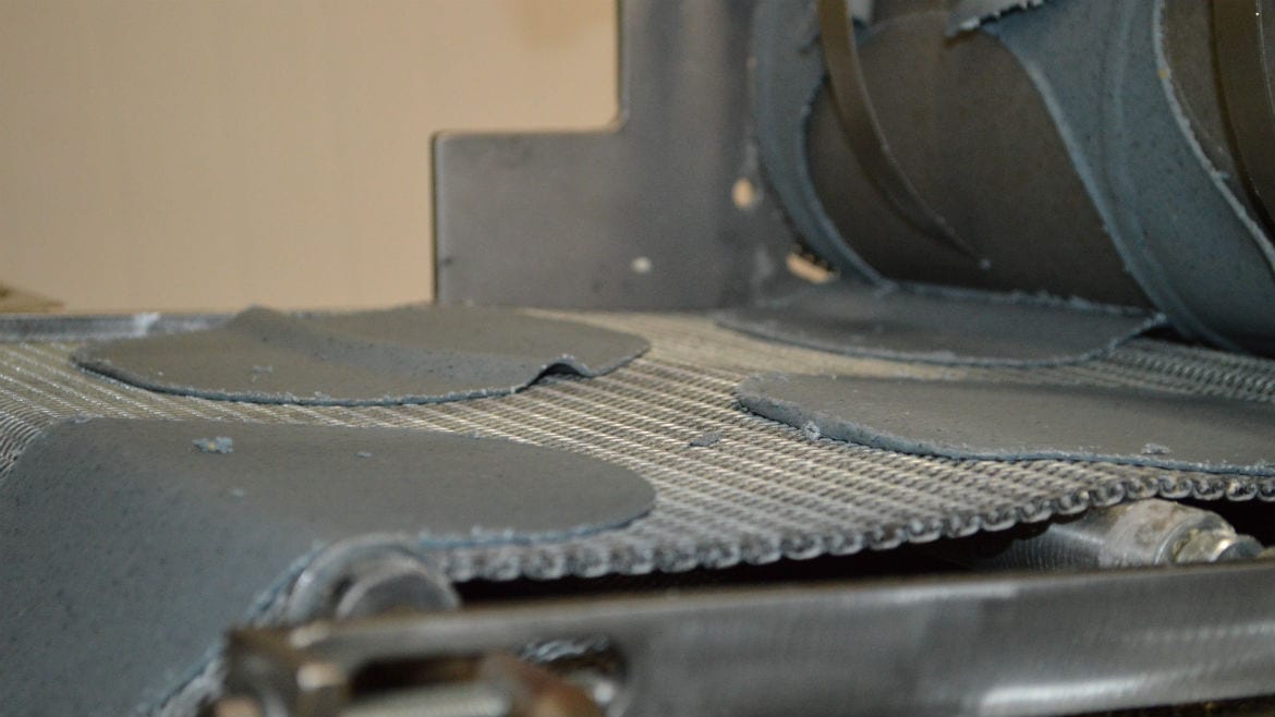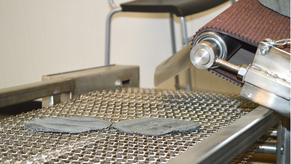 Mark next places the masa into a hopper, where it is rolled out on a drum. The masa is then cut into circles and drops onto a conveyor belt.