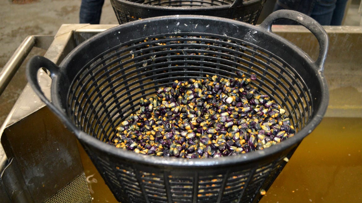 The entire process for making tortillas is called nixtamalization. The corn is first soaked in water and food grade lime, which helps soften the kernel shells. The corn simmers in a large metal pot overnight before being transferred to small plastic baskets.