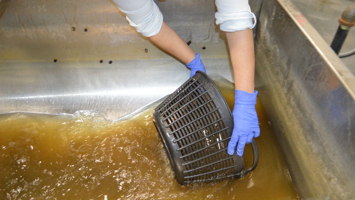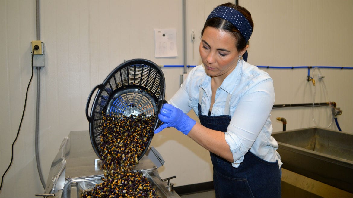 The corn in the basket is then rinsed by Marissa before being walked over to the grinder.