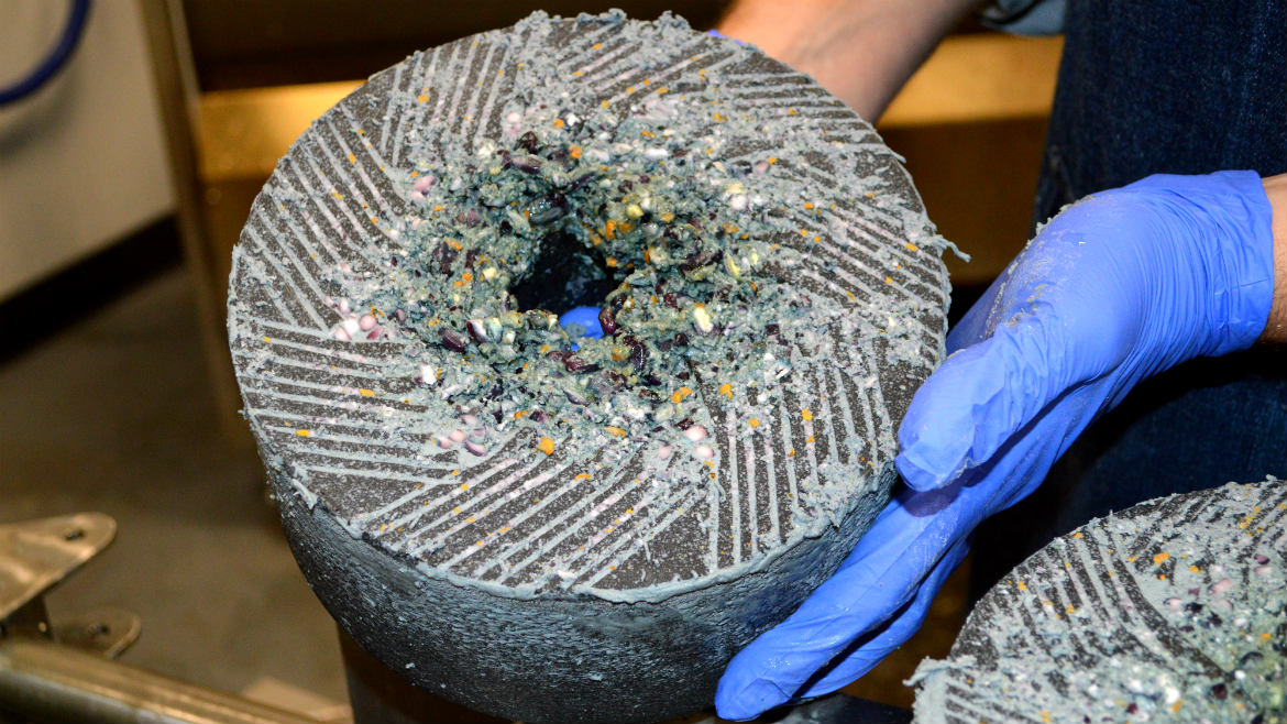 The corn is ground between a pair of volcanic stones. The two stones are from the Campbell Machine Shop in Santa Fe Springs, California. The Gencarellis spent three weekends at the shop learning how to grind corn, cook tortillas, and repair their own equipment.