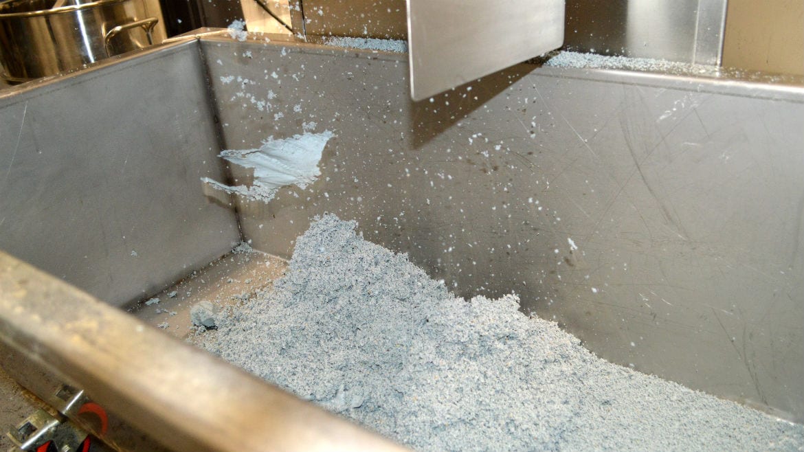The finely ground corn cascades down from the grinder and is caught in a metal bin.