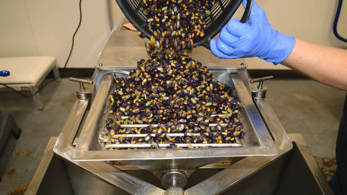 The rinsed corn is fed into a funnel that sits atop the grinder.