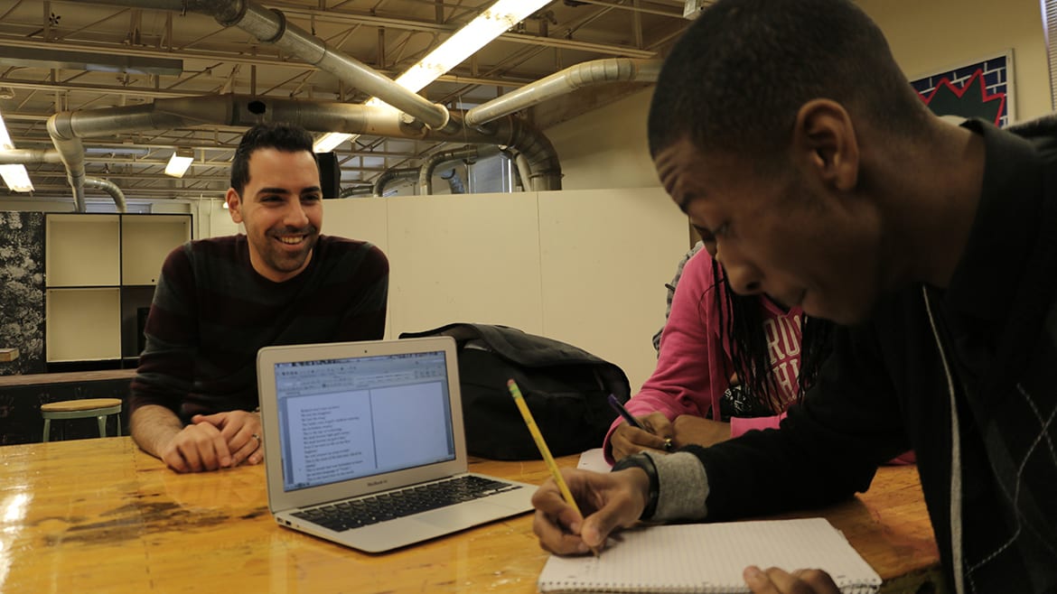 Washington High School poetry slam coach Miles Azzeh talks with student Willie Tolon in the school’s “wordshop.” (Photo by Lindsey Foat)“Louder Than a Bomb is the largest youth poetry slam in the nation,” said Azzeh, who now coaches the Washington High School team. “It’s an awesome opportunity for students to share their work, talk about their communities, and it’s just a great community-building endeavour.”